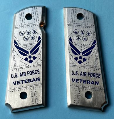 This Laser Engraved Pistol 1911 Full Size Grip is made from Aluminum and has a Air Force Blue CERAKOTE paint inlay.