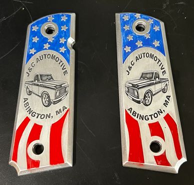 Custom Laser Engraved Pistol 1911 Full Size Grip for a Local Business is made from Aluminum and has CERAKOTE paint inlay.